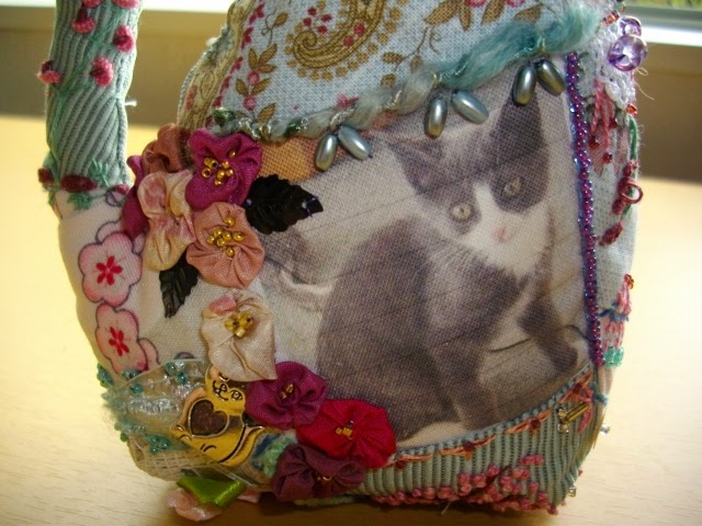 For my crazy quilt project I wanted to make a case for my tablet. I had a peacock theme as you can see. The case is held with a Velcro strap with a brass peacock that I got from a place that sells supplies for paper crafts. It is lined in a green peacock fabric, padded and the back fabric is a purple peacock fabric, the same as you can see on the closure.